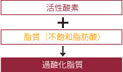 体内や体外にある脂類(不飽和脂肪酸)と活性酸素とが反応して、体内の脂を酸化し、過酸化脂質(悪玉コレステロール)を作り出します。この過酸化脂質は活性酸素に比べて力は弱いのですが、白く濁った液状の脂で、尿から体外に排出されず、組織や臓器の表面に付着して侵入していきます。長時間かけて臓器や組織を破壊していくという、性質の悪い化学物質なのです。